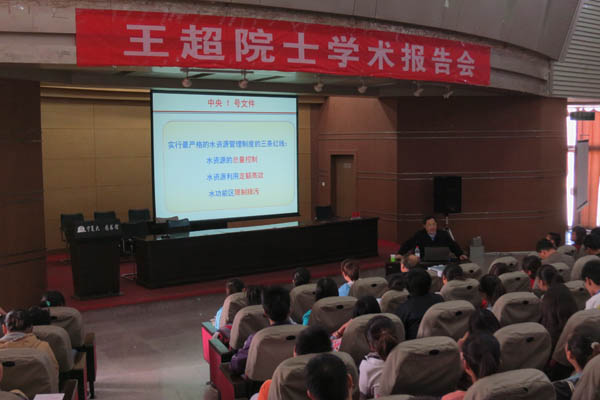 王超院士以《实行水功能区限制排污的核心科技问题》为题,详细介绍了全国水功能区的内涵、作用、划分原则、划分方法以及水功能区限制排污红线的主要内容和发展历程,着重介绍了全国水功能区划中解决的理论难题以及一系列关键技术。王院士从自己的科研实践出发,对如何将学术思想转变为政府、社会的具体实施向当代大学生、研究生以及青年教师提出了殷切的希望。王院士的报告语言简练易懂,内容详实精彩,全场先后六次响起热烈的掌声,得到在座师生的一致好评。在报告结束后,王院士还介绍了河海大学环境AG亚游官网