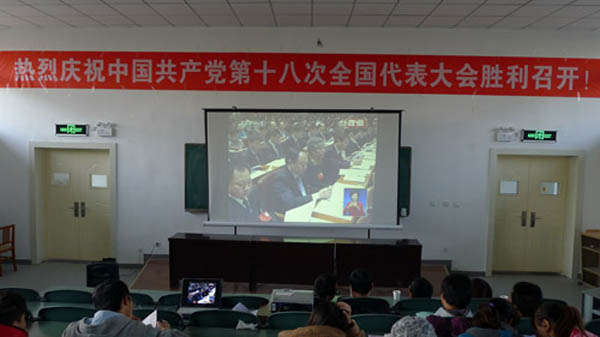 领导、各系主任、三办主任、各支部书记、教师党员、学生党员和入党积极分子集体收看党的十八大开幕会盛况。