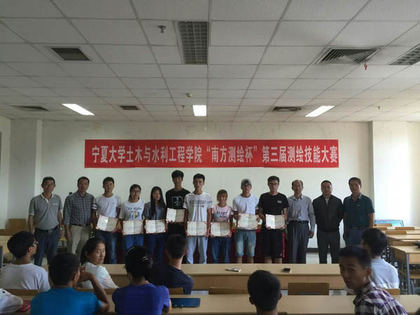 刘海峰副院长,本次测绘大赛的组织者杨自明老师,林卫公老师,刘国庆老师以及赞助商南方测绘银川分公司的领导出席并为获奖同学颁发了奖状、奖品。