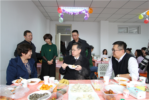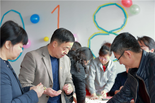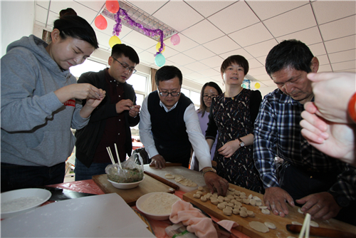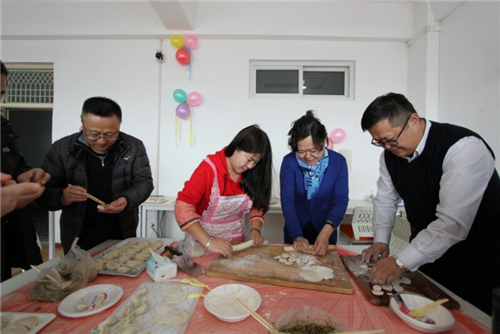 党政领导来到各系活动室,与各系教职工一起准备食材、布置场地,准备包饺子活动。之后,各系教职工纷纷到齐,踊跃参加新年活动。每位在场教职工各有分工,擀面皮、包饺子的迅速有序展开,大家迫不及待地挽起了衣袖大干起来。窗外寒意袭人,屋内暖意融融。一会儿功夫,在大家齐心协力下,饺子很快都包出来了,在大家欢喜声中,热气腾腾的饺子已经出锅,教职工们兴高采烈端饺子、拌调料,纷纷露出笑容并与自己的作品合影留念,高兴地品尝自己的劳动成果。