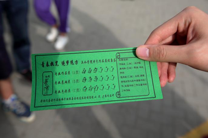 董教授认真仔细地对专业作品区(A类)、专业基础区(B类)和专业色彩区(C类)的每一幅作品进行了评审,并不时向学生询问作品的设计思路等内容。参观结束后,董教授在选票上选出了自己心目中的优秀作品,与前来参观的同学进行了亲切交谈,与大家分享参观的感受,并对AG亚游官网