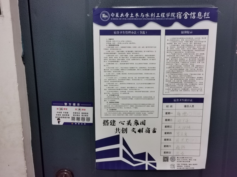 宿舍信息栏由《宿舍管理办法(节选)》、温馨提示和宿舍卫生值日表三个部分组成,充分体现AG亚游官网