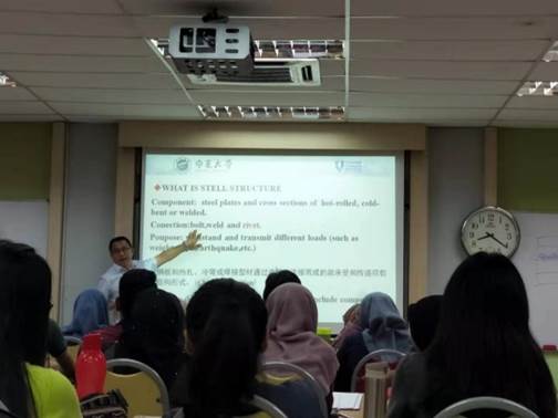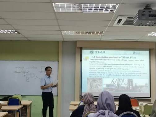 先后派出近十名教师赴美国、马来西亚、英国和澳大利亚等国开展为期一年的交流学习,旨在提升教学理念和改进授课方法。近日,前往马来西亚彭亨大学的5名教师圆满完成了专业课英语授课工作,并得到马来西亚学生的广泛欢迎和校方的充分肯定。在彭亨大学,王斌教授以主题讲座形式介绍了中国钢结构发展进程;车佳玲副教授完成了《Reinforced Concrete Design 1》中《ReinforcedConcrete Slab Design》章节8个课时的教学工作;包超副教授完成了《Foundation Engineering》课程中两周共计12个课时的教学工作;李超超副教授和申晓晶老师共同完成了《Hydrology and Water Resource》部分章节的教学任务,并分别做了《水文模型-HMS模型》、《水文模型-SWAT模型》的专题讲座。