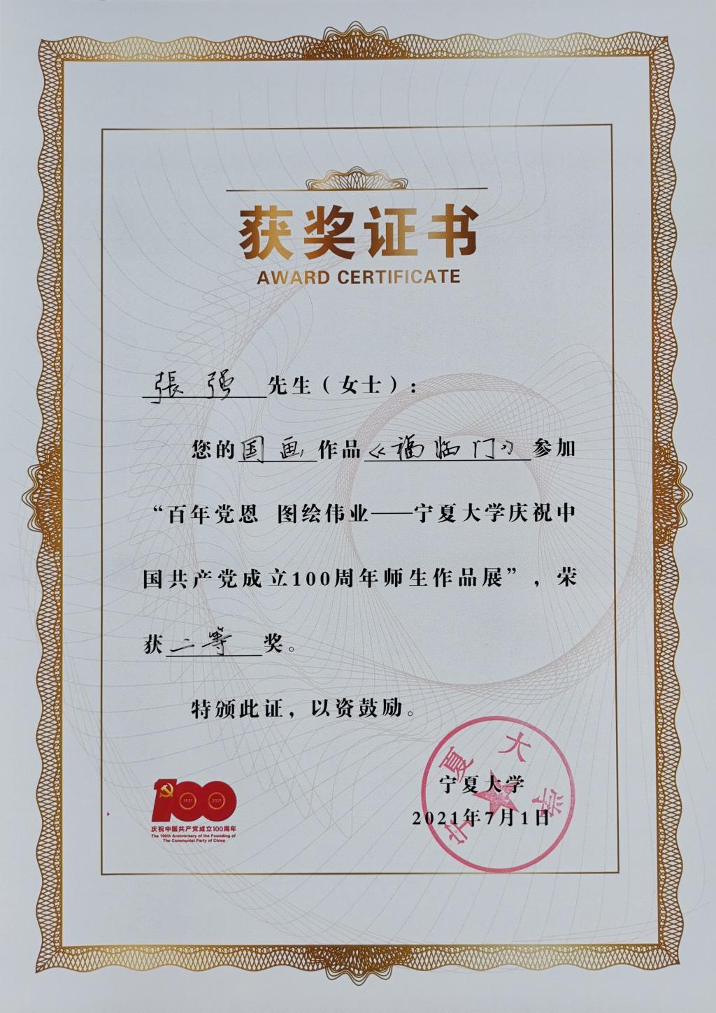 庆祝中国共产党成立100周年师生作品展”二等奖