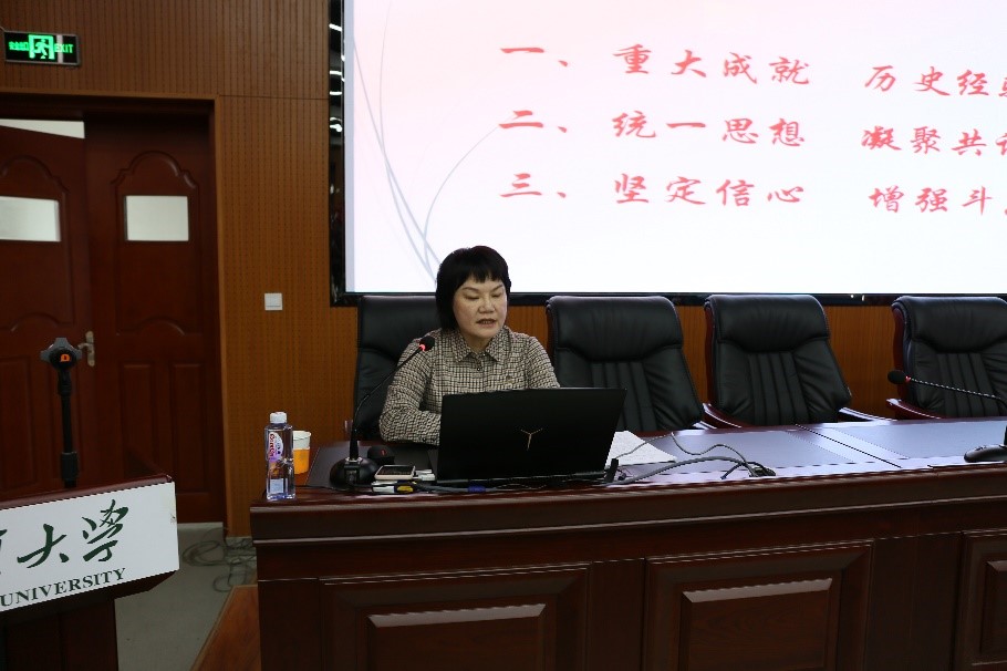 党委副书记尹娟对周萍老师所做的精彩报告表示感谢,并做了总结发言。她强调,全体师生要在党史学习教育学习成果基础上,继续认真学习贯彻党的十九届六中全会精神,通过开展形式多样的主题活动交流和研讨学习心得,不断加深认识、深化理解,并把党的十九届六中全会精神实实在在的体现在我们教书育人、立德树人工作当中。各位教师要通过课程思政的方式,把我们学到的、领会到的精神实质、思政知识元素、先进的思想传授给我们的青年学生,真正实现为党育人、为国育才,为培养时代新人、推动教育事业高质量发展贡献自己的一份力量。