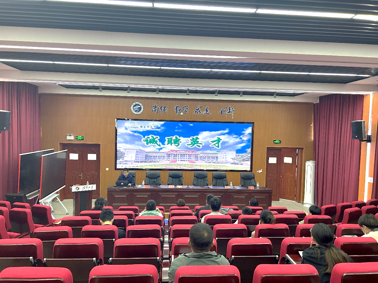 书院改革以及2024届毕业生的情况。王兴鹏院长详细介绍了塔里木大学的历史沿革、红色基因、组织架构、院系设置、师生规模、科学研究、人才引进政策等情况,尤其是对引进博士、硕士的扶持政策以及对在读博士的预引进政策引发了研究生的高度关注。会上还播放了塔里木大学宣传片。