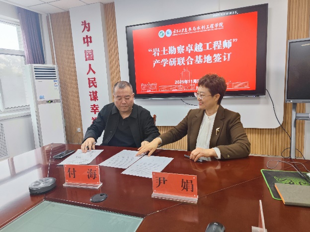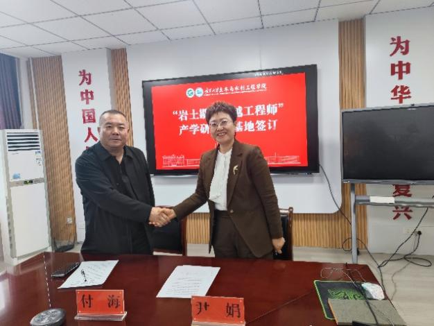 党总支书记尹娟教授与宁夏海辉岩土工程有限公司总经理付海代表双方签署了“岩土勘察卓越工程师”产学研联合基地框架协议。协议的签订,标志着校企合作进入了实质性的新阶段,为未来在人才培养、技术研发、成果转化等方面的深度合作奠定了坚实基础。
