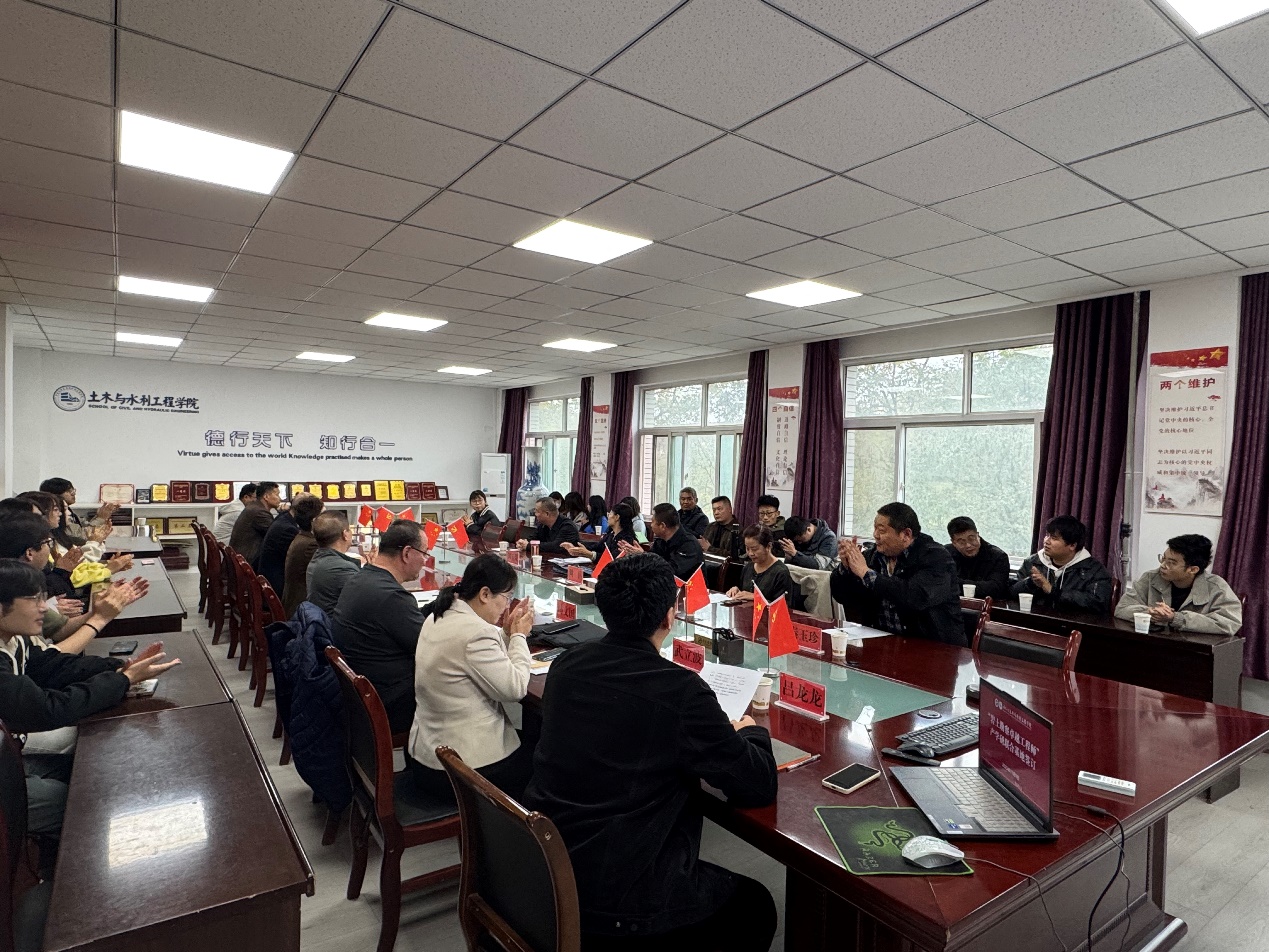 党总支书记尹娟,副院长刘海峰、李王成,党总支委员/土木工程专业负责人车佳玲、李学丰教授、马文国副教授、武立波副教授、余鹏准聘副教授、吕龙龙准聘副教授(兼宁夏海辉岩土工程有限公司科技副总)等岩土学科学术骨干,首批入选培育计划的同学们,共同见证这一践行产教融合政策的实践成果。会议由土木工程系党支部书记吕龙龙主持。