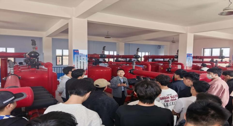 在二号蓄水池加压泵房,王炳亮老师结合工程实景,细致讲解现代化灌区灌溉体系的组成,对比传统渠道灌溉与现代滴灌、喷灌、智能灌溉的技术差异与应用场景,阐释智慧水利、现代化灌区以及现代农业生产的发展趋势在灌区一线的落地实践,帮助同学们把课堂上的水力学、灌溉排水工程学、水利工程管理等���论知识,转化为看得见、摸得着、用得上的工程实践能力。大家清晰理解了从水源调度、泵站加压、管网输送到田间精准配水的全链条运行逻辑,直观认识到节水优先、智能管控对保障粮食安全、推动农业现代化、建设生态灌区的重要意义,进一步夯实了专业基础、拓宽了工程视野,也更加坚定了以专业所学服务水利事业、助力乡村振兴与生态文明建设的理想信念。