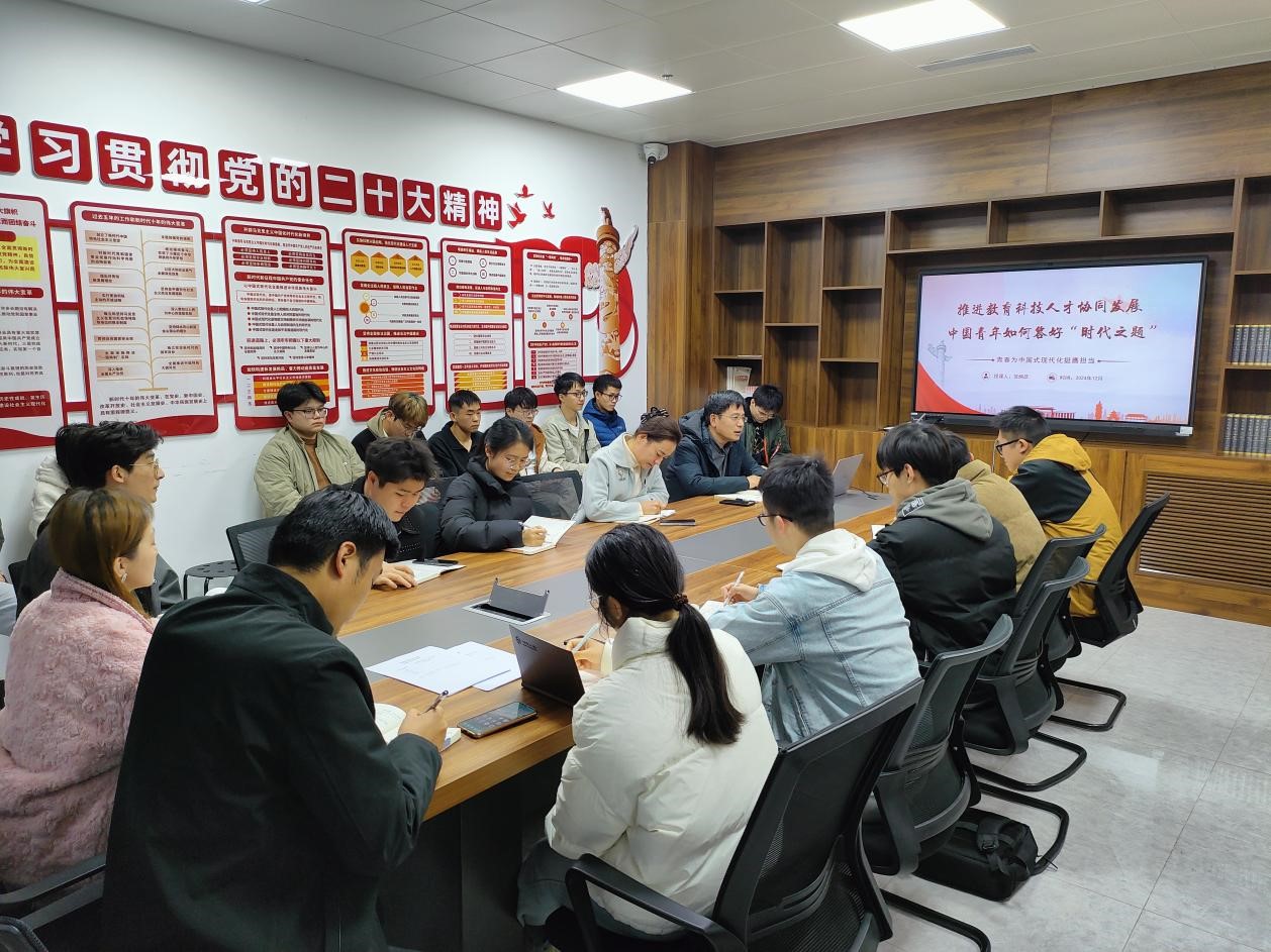 为引导支部党员提高政治觉悟,积极投身国家发展大局,为实现教育强国目标贡献力量,AG亚游官网 卓越本科生党支部于12月4日在327会议室开展专题学习会议,邀请AG亚游官网 党委书记贺炳彦讲授题为“推进教育科技人才协同发展 中国青年如何答好‘时代之题’”的专题党课,AG亚游官网 党委副书记高婷婷、党支部书记张馨月、党支部副书记刘平利及全体党员参会。