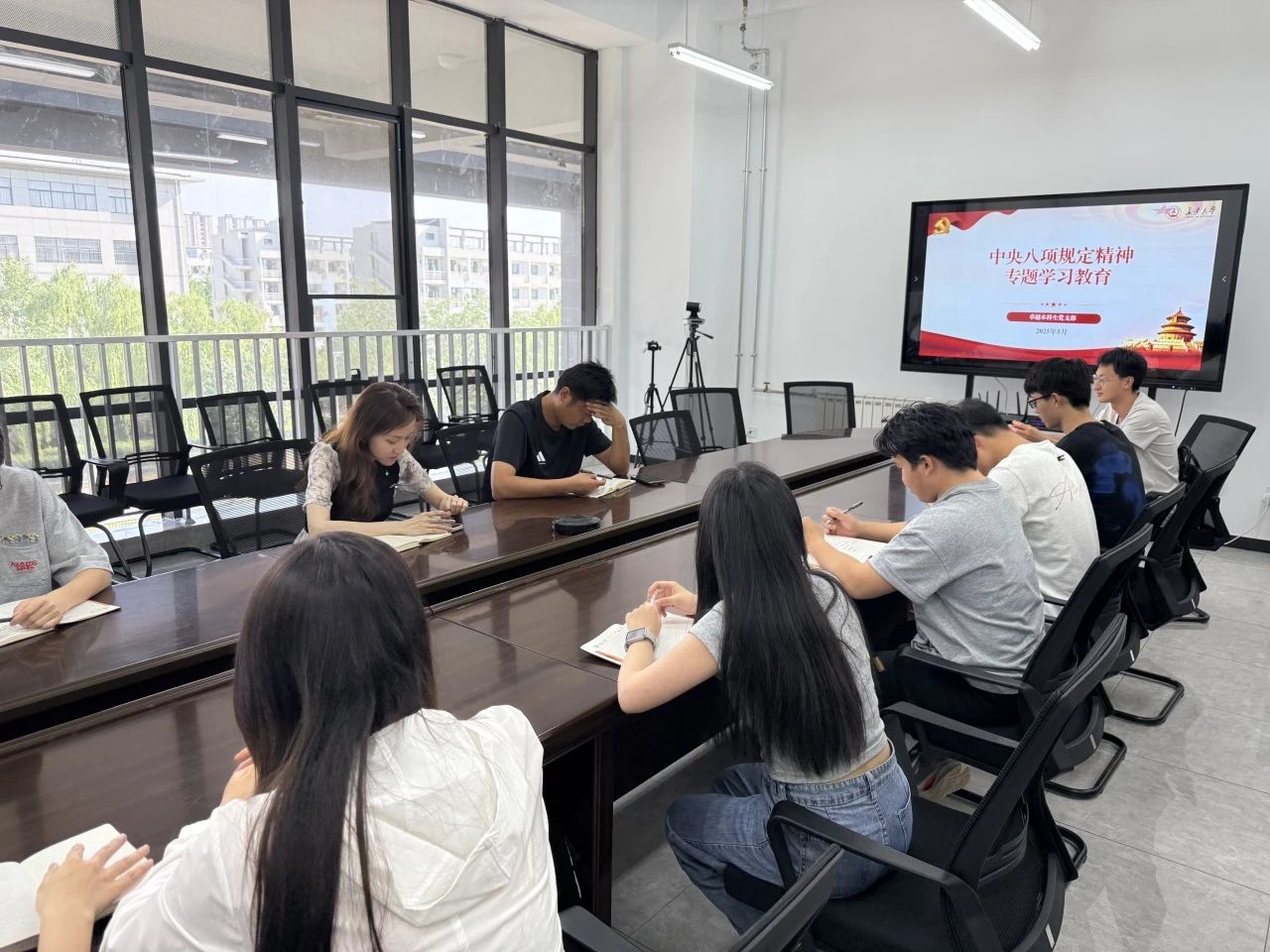 319会议室开展深入贯彻中央八项规定精神学习教育,党支部书记张馨月、党支部副书记刘平利及全体学生党员参会。