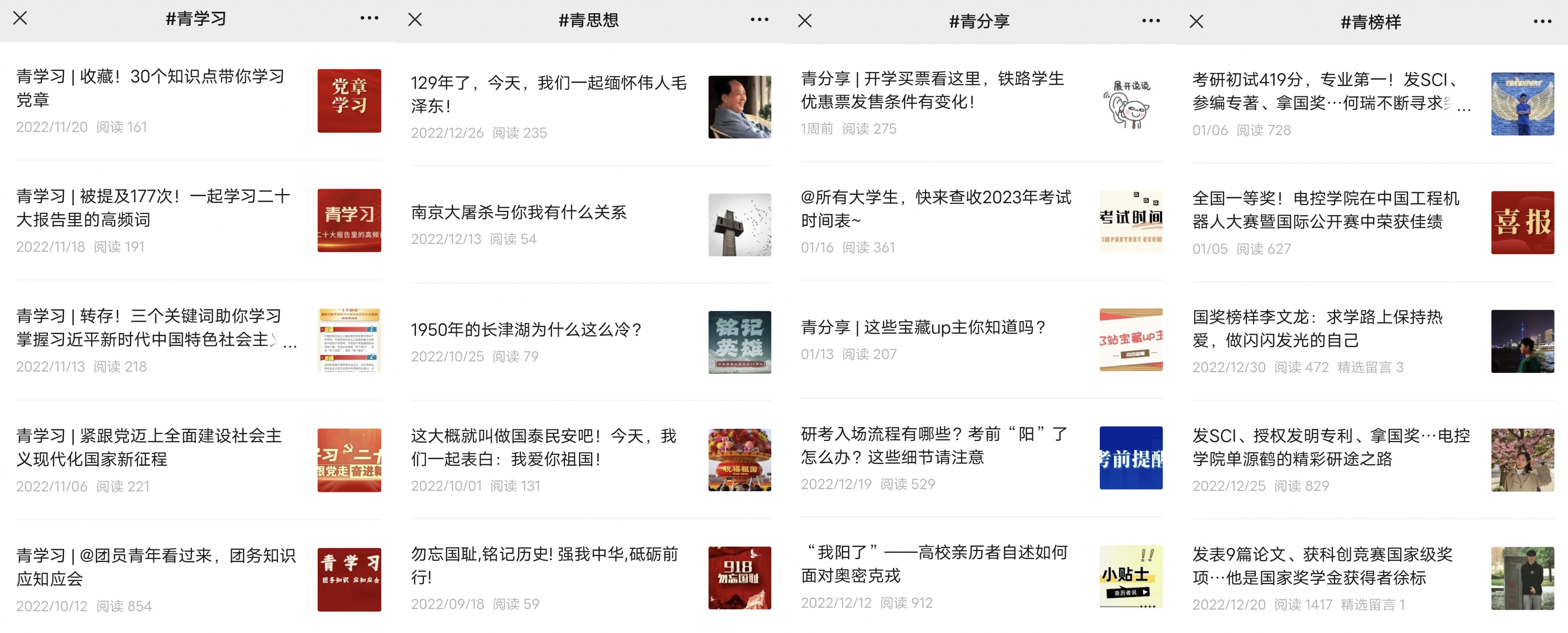党群工作、教学科研、学科建设、学生工作、榜样故事、文化活动等内容,逐步形成了以“聚焦电控”“活力电控”“青春电控”为主要版块的具有电控特色的公众号品牌,公众号排名稳定在院系排行榜前三,并多次位列第一。