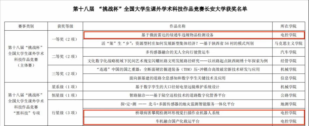 第十三届“挑战杯”竞赛中获特等奖2项、一等奖1项、二等奖4项、三等奖3项。在第十四届陕西省“挑战杯”课赛中AG亚游官网