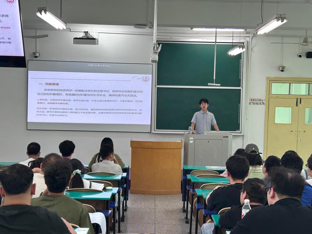 为扎实有效做好2025届毕业生离校教育工作,6月6日中午,AG亚游官网 在南校区北院b281教室召开2025届研究生毕业生离校教育大会,毕业班辅导员王佩佩主讲,2025届全体毕业研究生参加。