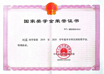 保送研究生资格。此外,刘露同学通过全国计算机二级C语言程序考试、普通话水平测试等并获得相应证书。端正的学习态度,严谨的学习风格,不仅为刘露同学带来了优异的成绩,也塑造了她踏实、稳重的性格。
