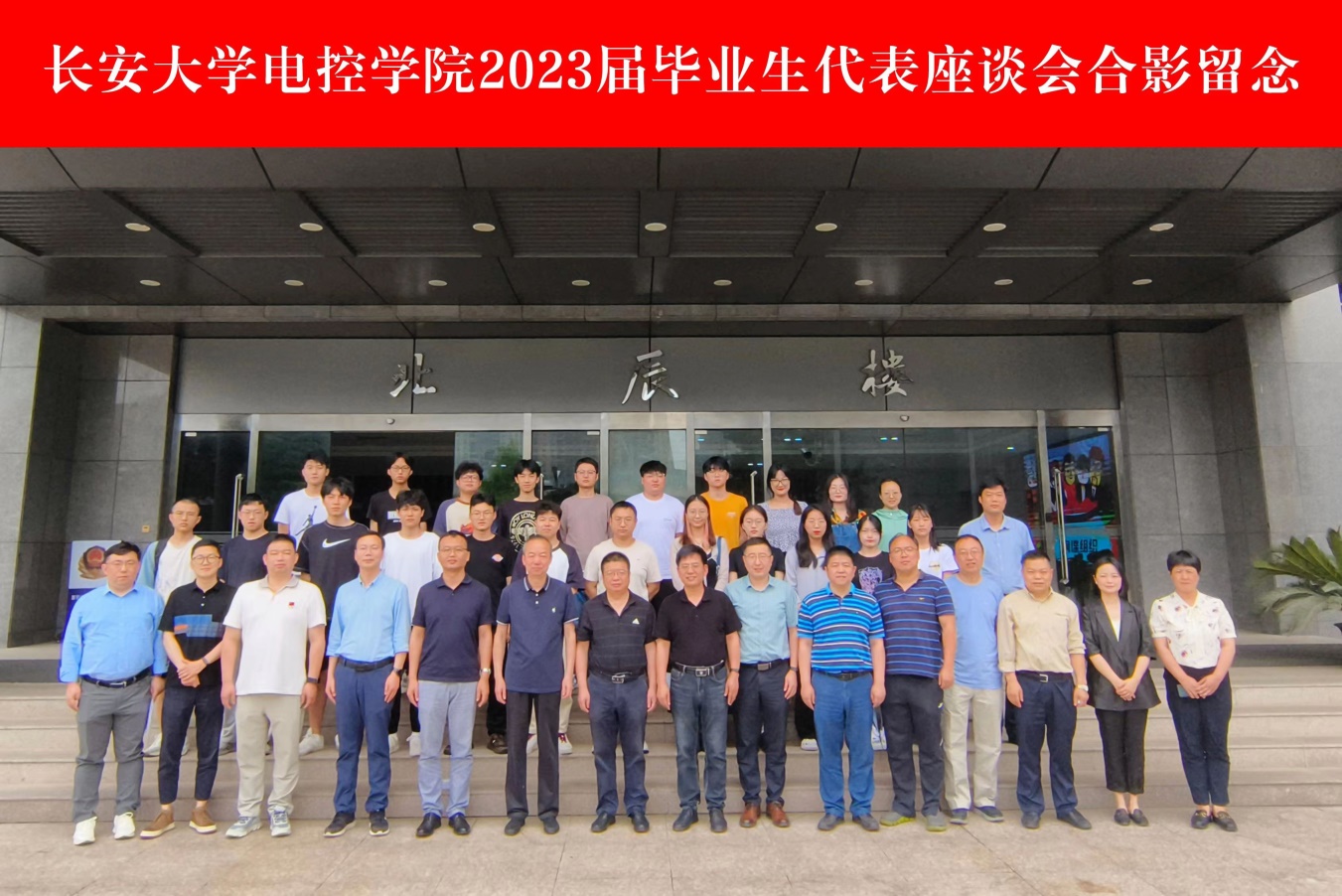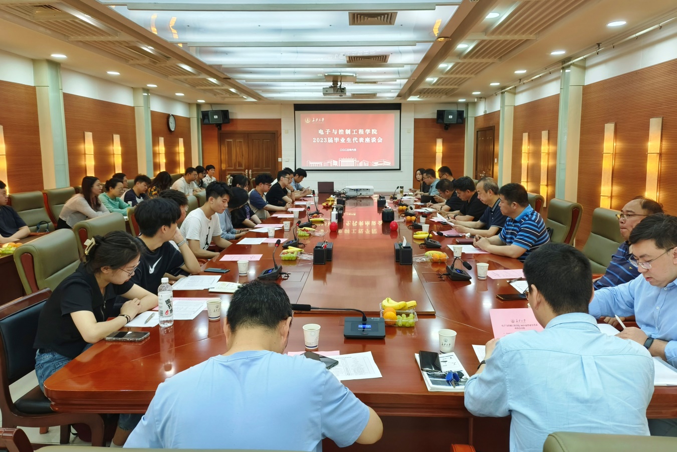 在北辰楼会议中心第二会议室召开2023届毕业生代表座谈会,全体院领导、各系部室主任、学科科研研究生培养与管理主管、毕业班辅导员和本科生、研究生毕业生代表参会。座谈会由学办主任高婷主持。