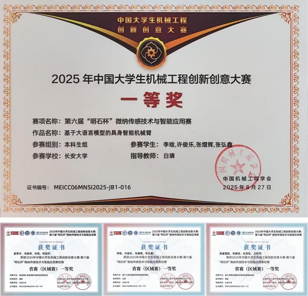白璘副教授指导的李晗、许俊乐、张熠辉、张弘鑫团队以“基于大模型的具身智能机械臂”为主题开发了一款集成了大语言模型的智能机械臂。作品围绕人工智能技术发展现状调研、关键技术攻关和硬件系统搭建,形成了完整的实施路径,并提出了大语言模型前端部署等关键问题的解决方案。凭借突出的技术创新与工程实现能力,团队赢得了专家评委的一致高度评价,最终斩获全国一等奖。AG亚游官网
