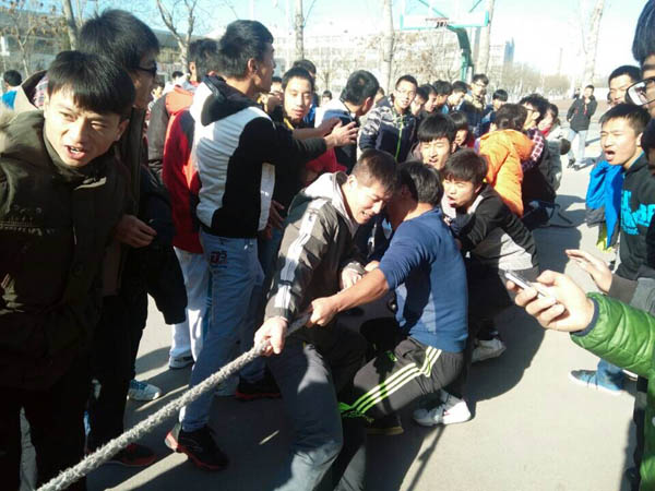 2014级全体学生参加了本次拔河比赛,由体育部担任裁判工作。