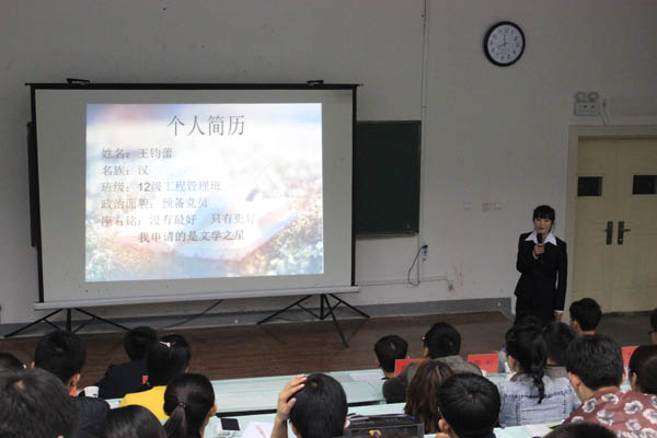 结合学科特色举办的大型评优活动,力图通过表彰先进、树立榜样,营造良好育人氛围。本项活动共评选“学习之星”、“自强之星”、“文学之星”、“文艺之星”、“实践之星”、“学工之星”、“体育之星”、“公益之星”、“道德之星”、“科研之星”十类。初赛各类“星”的4名候选人以演说的形式开展,展现其在道德、科研、实践、文学、文艺、体育、公益、文学、自强等方面的风采,在场的同学们被一则则动人的故事感动,掌声不断,现场气氛十分热烈。在经过严密的投票,计票环节,各类“星”中的两名佼佼者脱颖而出,进入决赛,希望进入决赛的同学能再接再厉,争取更高荣誉。