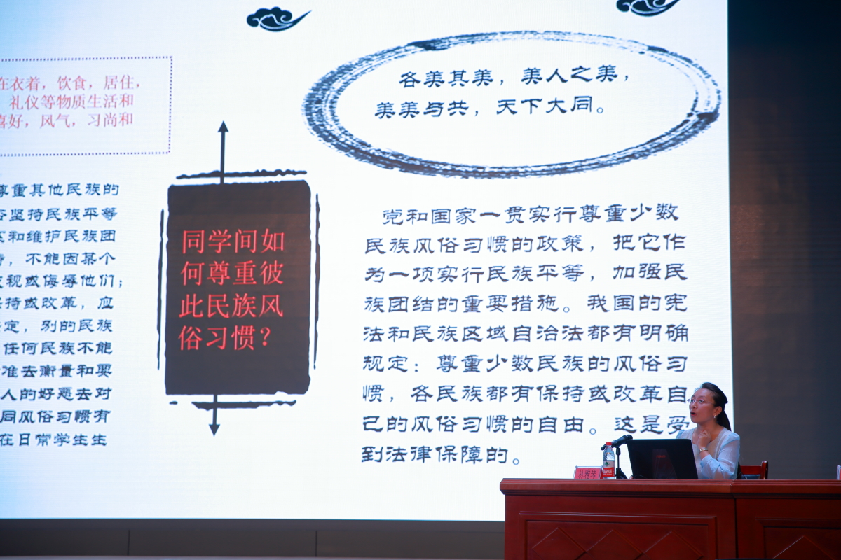 林雅琴副教授从党的民族理论政策、党的宗教理论政策、民族团结进步教育常识、当前民族宗教领域社会关注的几个问题等四个方面做了一场精彩的讲解。林教授旁征博引,从历史文化知识,到近现代典型案例;从宁夏地区风土人情,到国家基本国情;从正面经验,到反面教训,深入浅出地向我们阐述了报告深入浅出地向我们阐述了党和国家对民族宗教领域的基本政策、基本原则、基本方针和工作方法,并对当前社会关注的民族宗教领域几个热点问题进行了解答和回应。