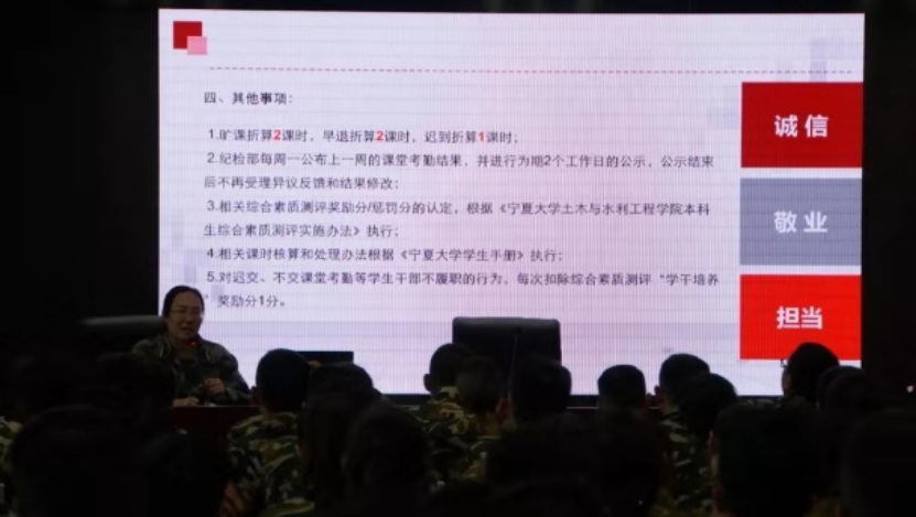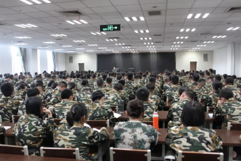 在国防之家召开了2019级新生入学教育大会,19级代理年级主任王娜指导19级全部学生学习校规校纪。