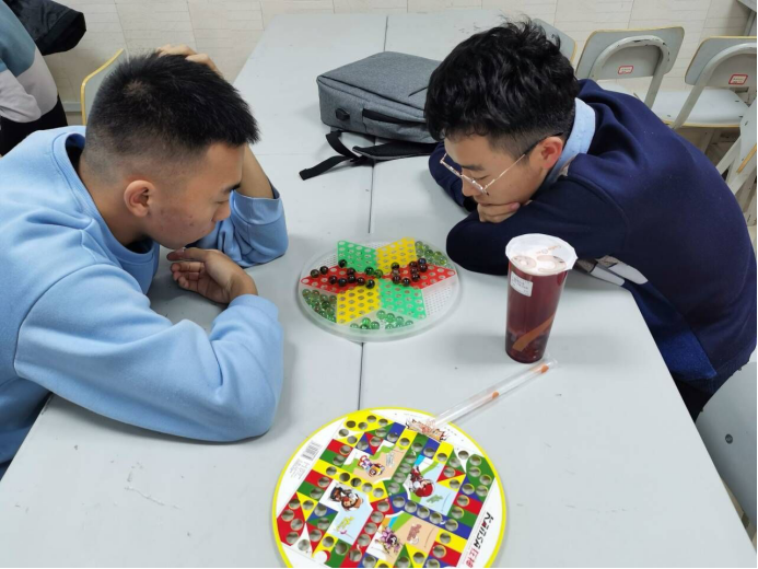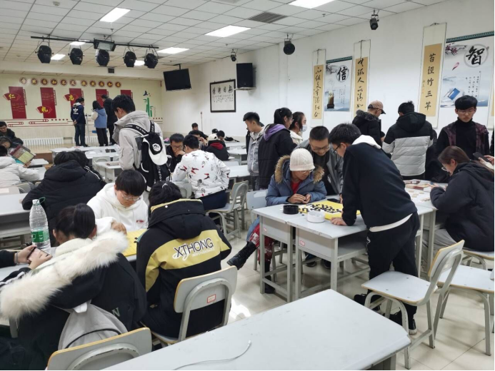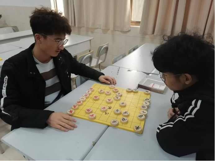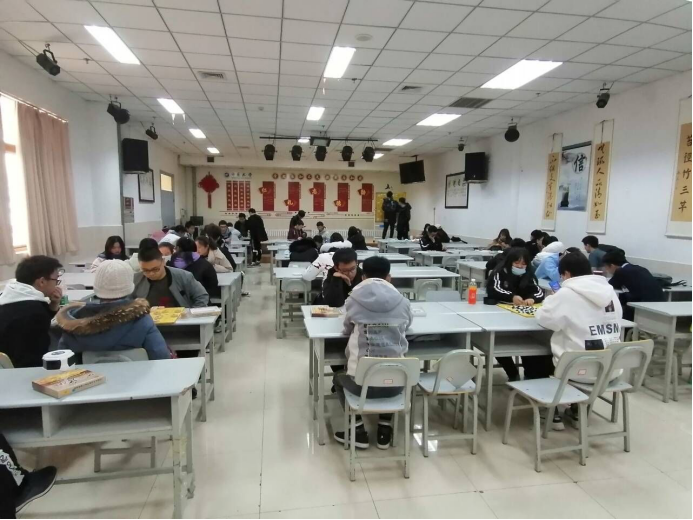 下午1:45左右,棋社干事陆续来到大学生活动中心118教室,在陈志斌的组织下,大家摆好棋桌,放好棋盘,等待着活动参与者的到来。2:00活动正式开始。同学们有的两两坐在一起开始对弈,也有的学习打谱,遇到不解处,棋社的棋队成员主动指点一二,同学们认真地学习着棋类知识。