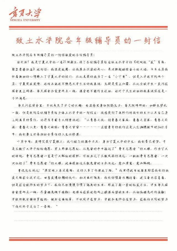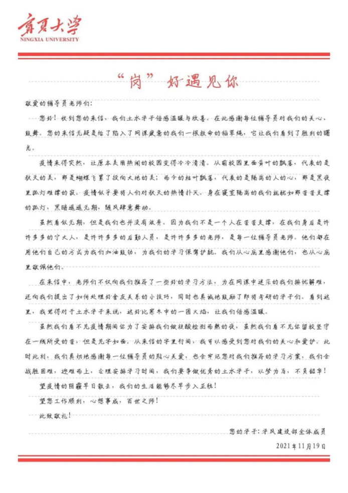 通过此次活动,让同学们意识到了疫情期间志愿者工作的不易与艰辛,更加理解志愿者工作的辛苦,对抗击疫情所作出的无私奉献,了解到了更多身边平凡的人对抗疫所做出的贡献,感受到各行各业的人们对疫情的关心。同时对辅导员的回信,感受到了辅导员对同学们的关心,增强了同学们对抗击疫情的自信心,更加积极地面对封校生活。
