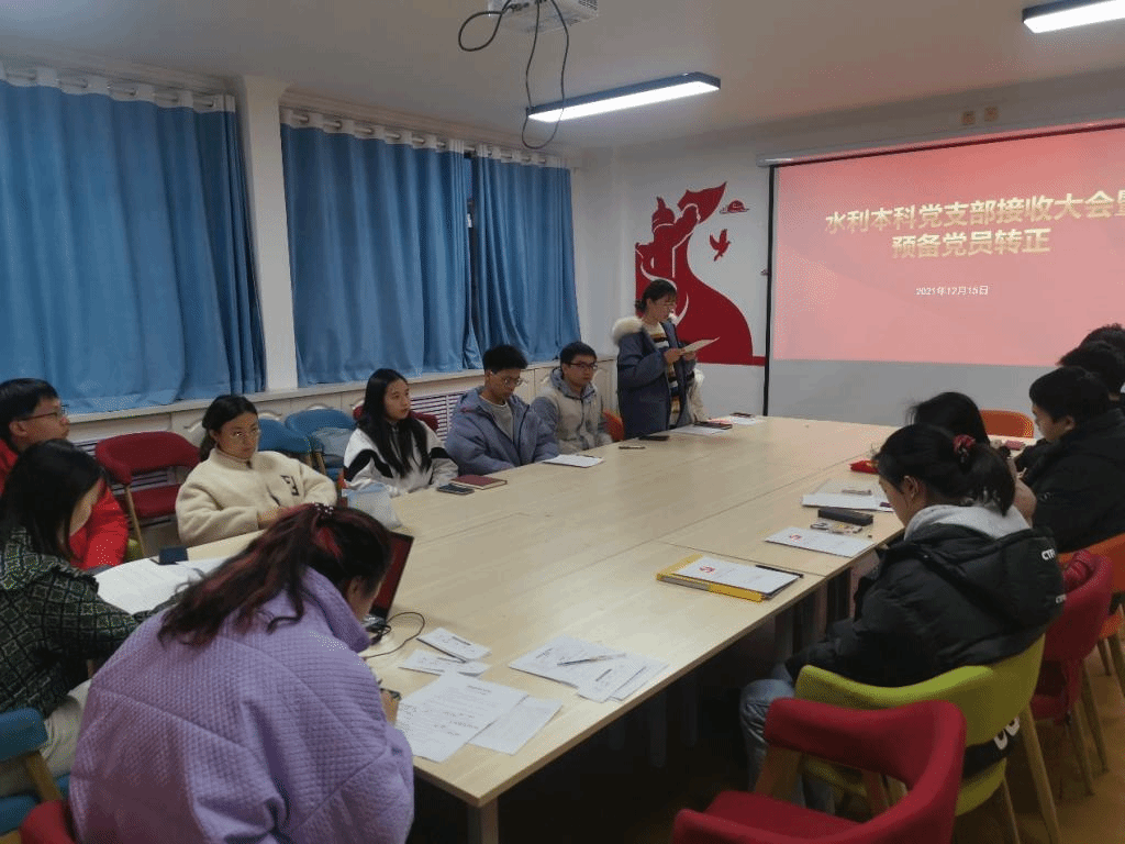 水利本科党支部于党员活动室召开党员大会,大会主要议题是讨论预备党员接收暨预备党员转正问题。支部书记梁冀宁主持此次会议,支部学生党员11人,发展对象3人参加会议。