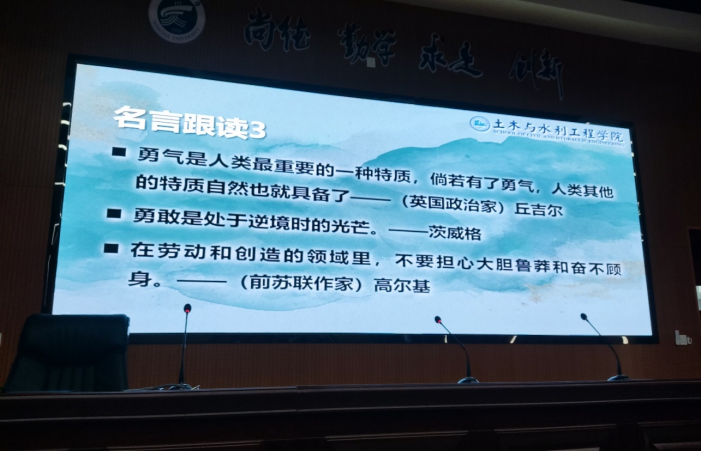 主持人带领在座全体师生朗诵,“勇气是人类最重要的一种特质,倘若有了勇气,人类其他的特质自然也就具备了”(丘吉尔)、“勇敢是处于逆境时的光芒”(茨威格)、“在劳动和创造的领域里,不要担心大胆鲁莽和奋不顾身”(高尔基)。