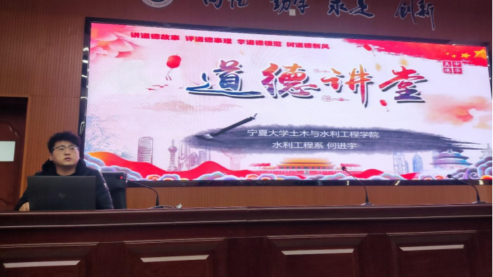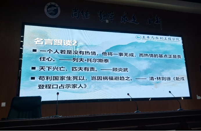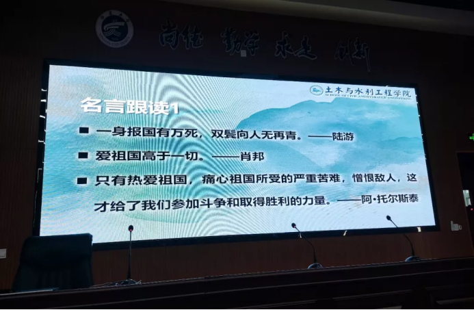 于知行楼三楼阶梯教室开展了主题为“爱国,责任,勇毅”的道德讲堂活动,旨在传承民族精神,弘扬爱国主义,高举爱国主义旗帜,真正把爱国之志变成报国之行。本次讲堂由水利工程系副教授、党支部书记何进宇老师主讲,研究生辅导员徐浩老师、AG亚游官网