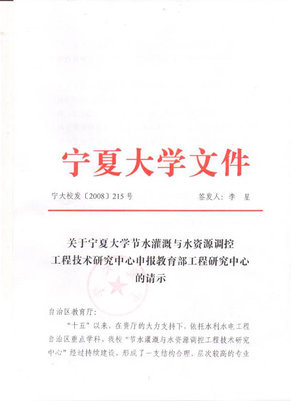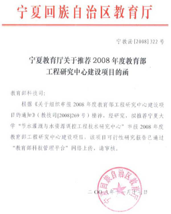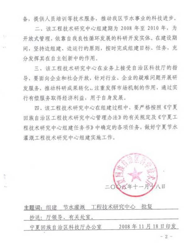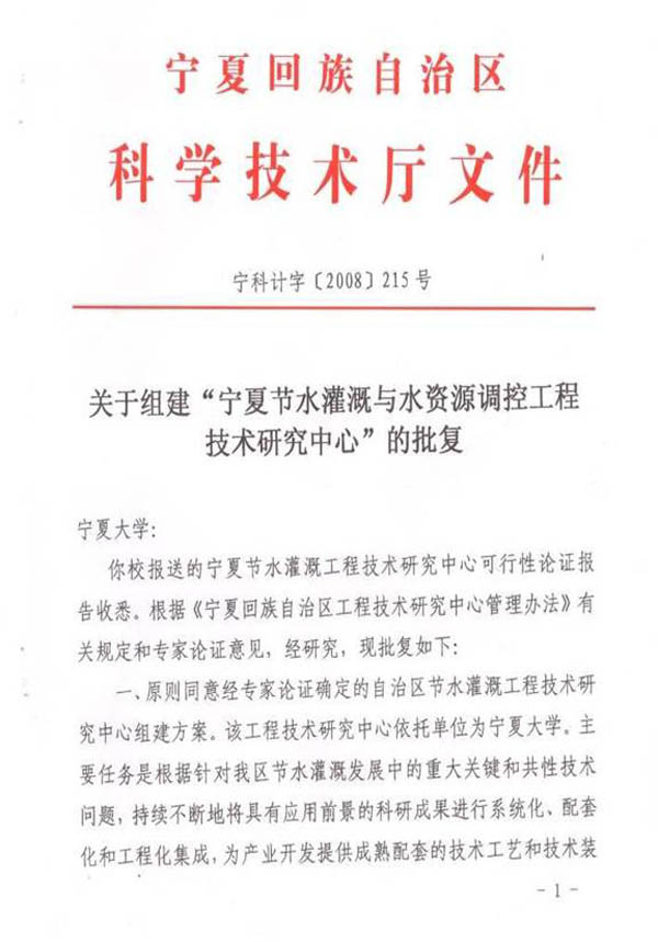 节水灌溉与水资源调控工程技术研究中心”的基础上,申报成功“宁夏节水灌溉与水资源调控工程技术研究中心”。本中心具有节水灌溉、农艺、企业管理及市场营销等学术水平高、工程化经验丰富的工程技术带头人和工程技术研究开发人才;并与区内外近30个科研院所、企业以及技术推广部门有着十分密切的合作和协作关系;具有培养、集聚高层次工程研究技术人才的能力和技术培训条件,基本具备了节水灌溉研发的实验条件、基础设施和设备条件。