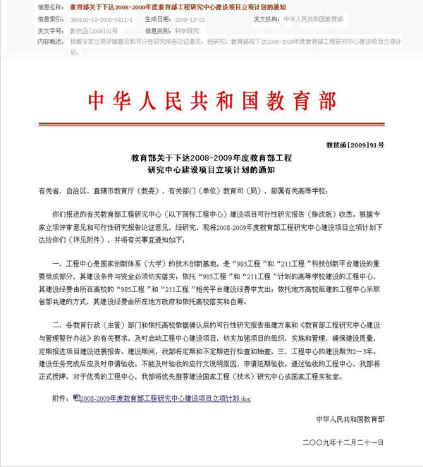 2008-2009年度教育部工程研究中心建设项目立项计划