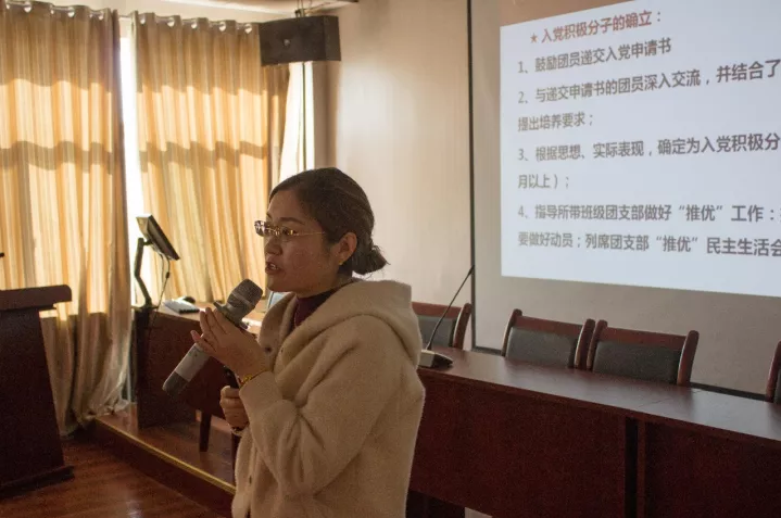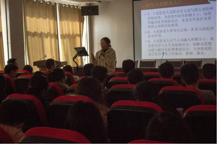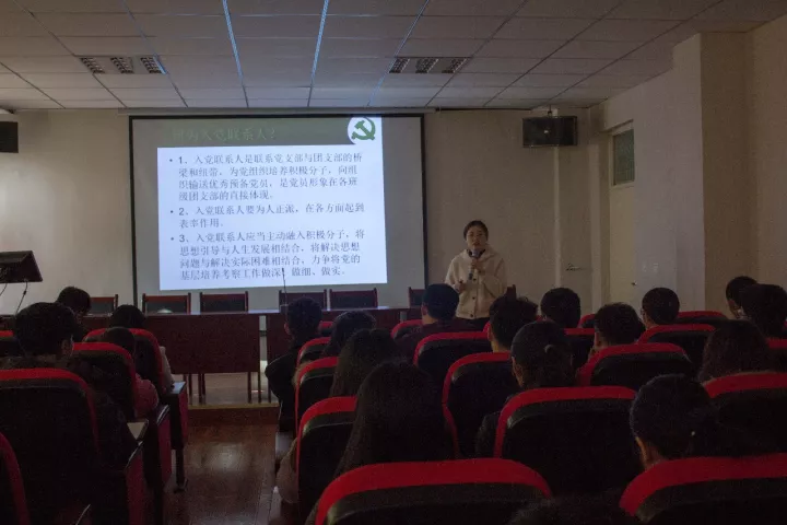 柳松洁首先提出了入党联系人的重要性,并且详细地介绍了入党流程以及对各党员,预备党员,入党积极分子的要求。紧接着柳松洁解说了入党联系人的基本工作,带领着大家学习党的理论知识,讲述了怎样确定与培养入党积极分子,发展对象的提出与发展材料的准备,学年工作计划及发展计划。她还重点提出入党联系人要加强与入党积极分子交流,应做到“一心”“两下”“三不”“四性”“五到”。最后,她简要地介绍了2018年党建工作要点,强调了要对党员,预备党员的生活和学习等进行评估,要求他们做到能真正地将为班级做贡献,为AG亚游官网