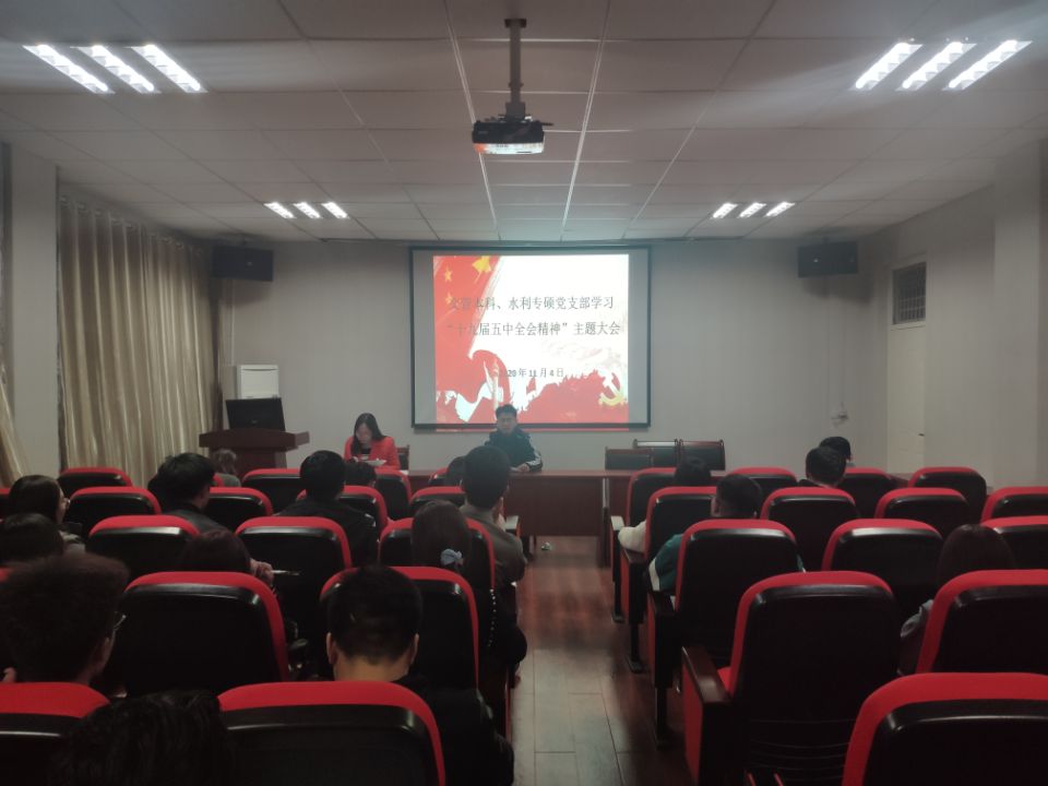 交管本科、水利专硕党支部在知行楼505室联合开展党的十九届五中全会精神主题学习大会,本次会议由支部书记王娜主持,交管本科、水利专硕党支部党员参加。