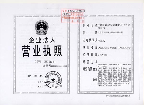中国能源建设集团北京电力建设公司集大型火电工程、房屋建筑工程、市政公用工程、风电工程、环保工程为一体的综合性国家一级施工企业,全国500强建筑业企业之一。公司注册资本金17000.7万元,具有“电力工程施工总承包壹级”资质,同时具有“房屋建筑工程施工总承包壹级”、“市政公用工程施工总承包壹级”、“高耸构筑物工程专业承包壹级”、“钢结构工程专业承包壹级”、“环保工程专业承包壹级”和“地基与基础工程专业承包贰级”的施工资质。作为电力施工企业,率先通过电力设施一级承装类资质、二级承试类资质认证。