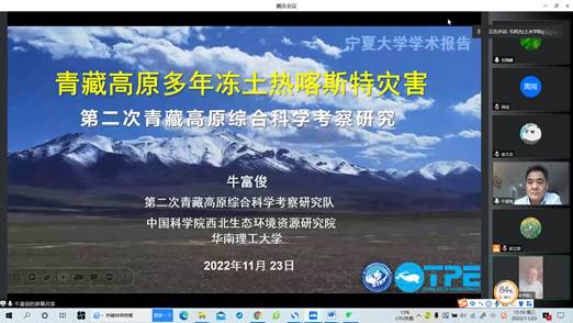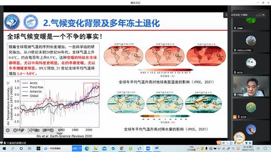 师生做主题为“青藏高原多年冻土热喀斯特灾害”的线上学术报告,报告会由毛明杰院长主持,AG亚游官网