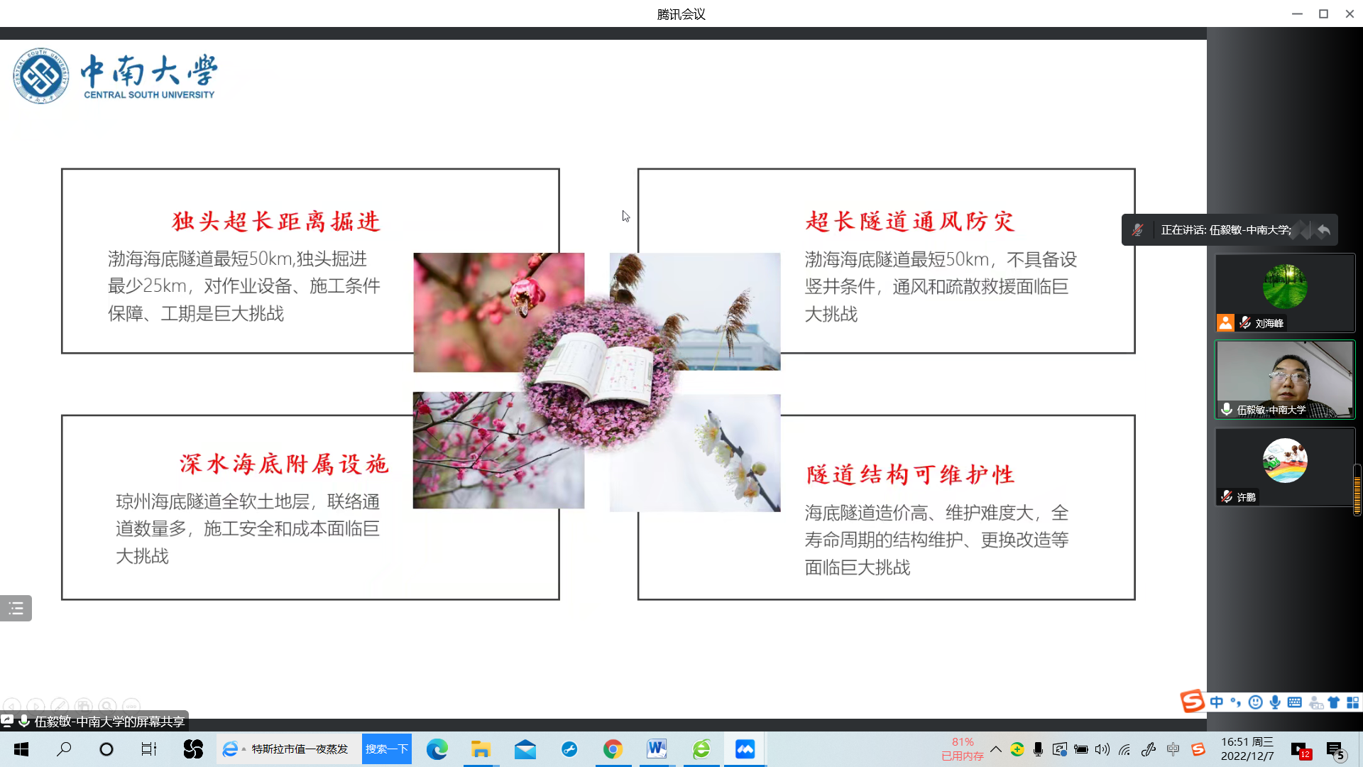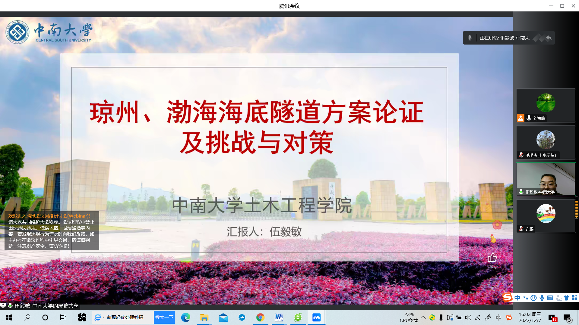 师生做题目为“琼州、渤海海底隧道方案论证及挑战与对策”的线上学术报告,报告会由毛明杰院长主持,刘海峰副院长和AG亚游官网