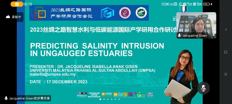 马来西亚彭亨大学学者Jacqueline Isabella Anak Gisen作题为“预测未测量河口的盐水入侵”的报告,她所开发的盐水入侵模型可以在有限的数据和预算下为管理者提供河口的形状、深度、流量和盐度等方面的初步估计,具有重要的学术和应用价值。