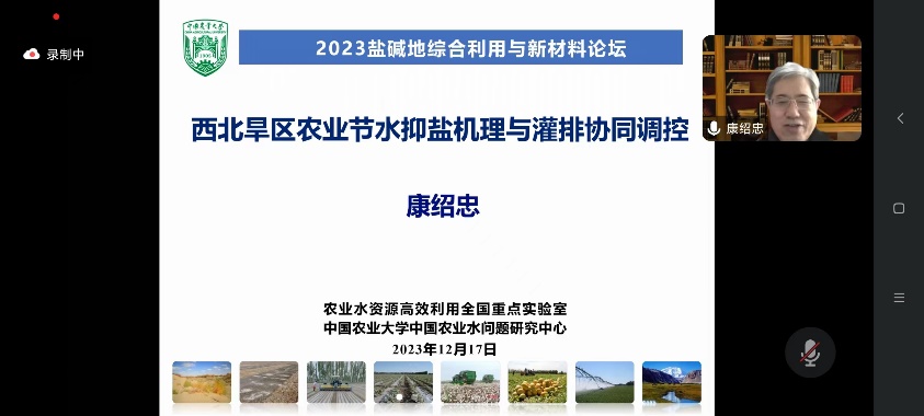 研讨会上,中国工程院院士、农业水土工程学家、中国农业大学教授康绍忠院士作题为“西北旱区农业节水抑盐机理与灌排协同调控”的学术报告,康院士从土壤水盐动力学过程与量化表征;作物水盐响应过程与根区动态阈值;农田节水控盐灌溉技术与系统优化;农田高效排盐材料改性与结构设计;区域排盐工程模式优化与灌溉系统调控五个方面系统介绍了目前应对西北地区盐碱地节水排盐机理和灌排协同调控的措施,为未来西北旱区农业发展指明了方向。