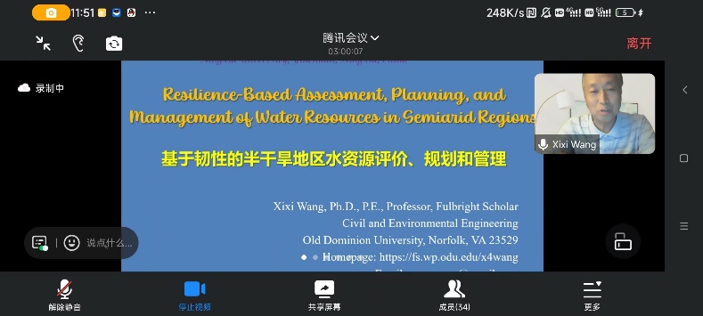 美国欧道明大学王喜喜教授作题为“基于韧性的半干旱地区水资源评价、规划和管理”的报告,他通过对比传统水资源评价方法和基于韧性的水资源评价方法在环境可持续性和原始生态被打破后的恢复难易程度,有效的指导了水资源评价管理和规划建设。
