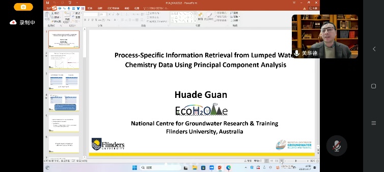 澳大利亚弗林斯德大学Huade Guan教授作题为“基于主成分分析的集中式水化学数据过程特定信息检索”的报告,他利用主成分分析法通过剔除数据里面存在的冗余信息,分析了南澳大利亚森林砍伐,地表植被变化后盐分在蒸散发过程中的变化规律,为区域地表变覆盖变化造成的水化学不平衡状态提供了新的分析方法。