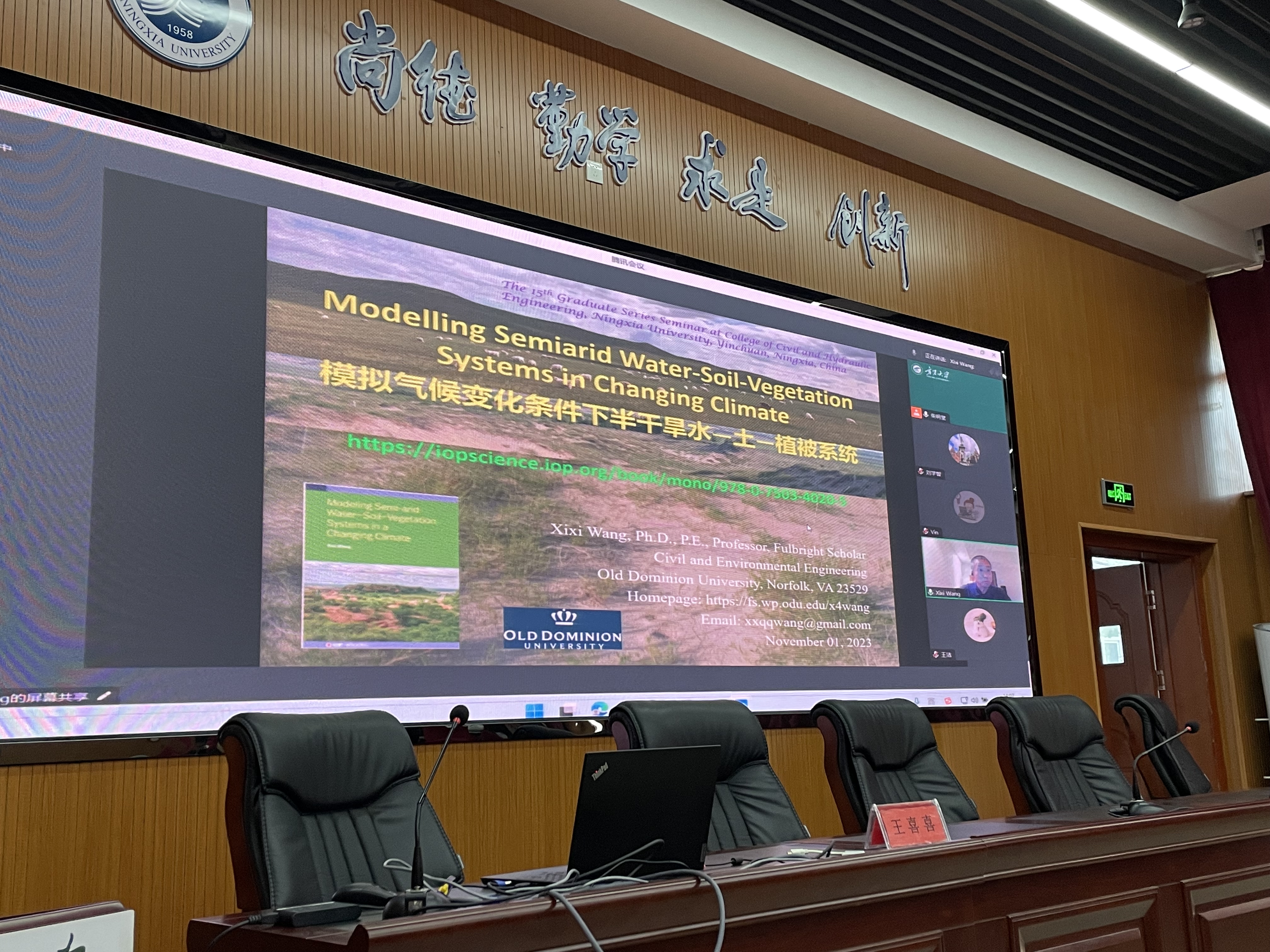 师生做题为“Modelling Semiarid Water-Soil-Vegetation Systems in Changing Climate(模拟气候变化条件下半干旱水-土-植被系统)”的学术报告。报告会由院党总支书记尹娟主持,线上线下同步的方式进行,现场有院党总支副书记徐利岗、副院长李王成及水利系师生160余人参加,另有200余人通过线上方式参加了报告。