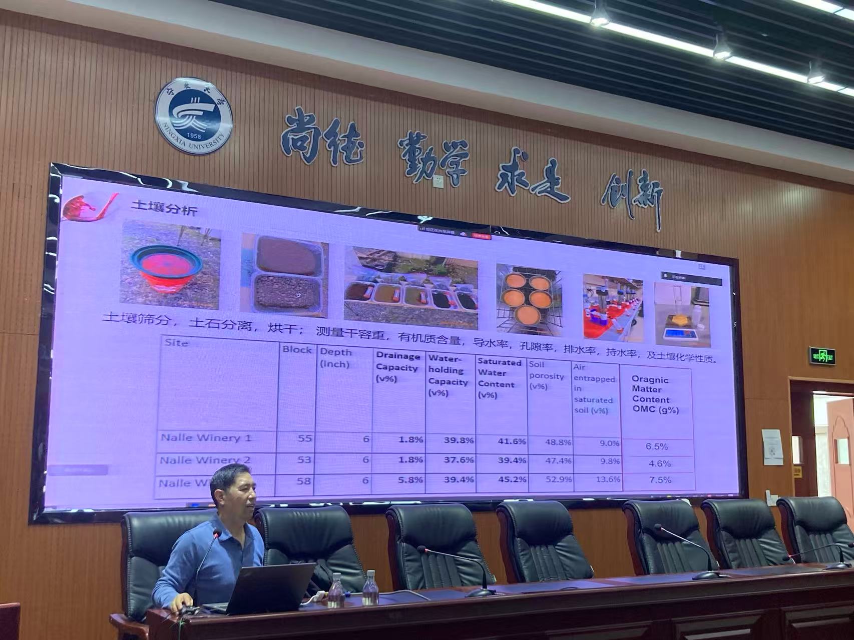 作为重要研究成果,王智教授重点介绍了土壤质量与葡萄酒品质的关系,认为土壤干容重、有机质含量、导水率、孔隙率、排水率以及化学性质等对葡萄、葡萄酒品质具有重要影响。最后,王智教授介绍美国加利福尼亚州水利工程建设情况、美国研究生就业状况及中美研究生培养特点。AG亚游官网 师生与王智教授针对土壤理化性质与葡萄品质的关系进行了热烈探讨、交流。