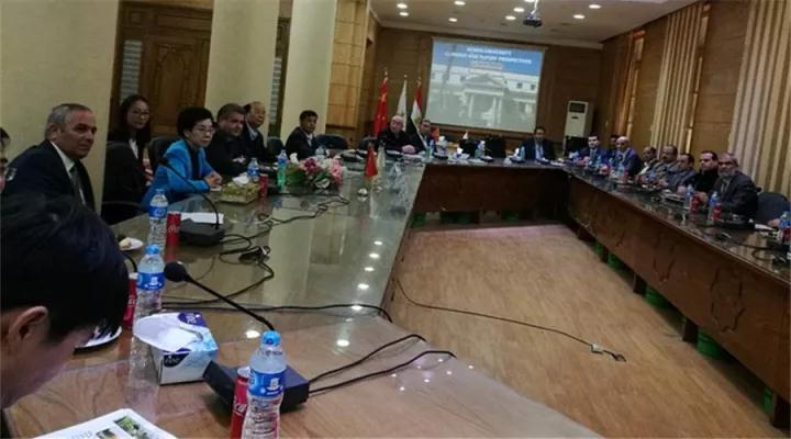 赛义德·凯迪校长首先对代表团一行远道而来拜访表示欢迎,他说今年9月份他前往中国银川参加了2017中阿博览会,科技板块活动举办的非常成功,给他留下深刻印象。本哈大学高度重视与中国高校的合作,在“一带一路”框架下,本哈大学与中国高校合作关系发展迅速,先后与武汉大学、北京林业大学等高校建立了合作关系,期待在中阿技术转移中心推动下与AG亚游官网